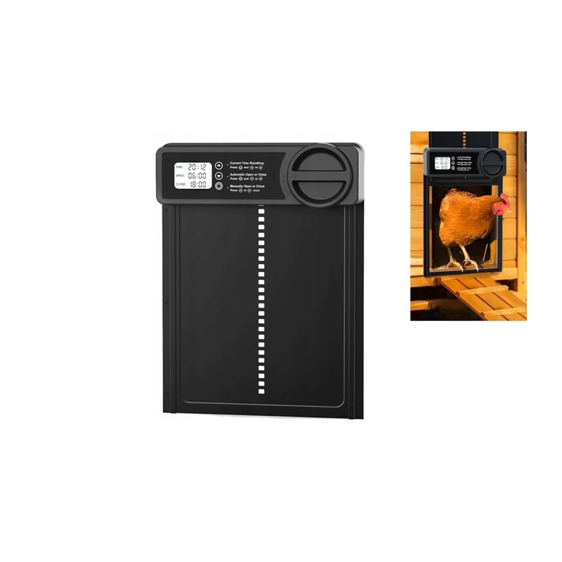 - Integrovaný senzor detekuje objekty v oblasti dverí a zastaví proces zatvárania, aby zabránil zraneniu sliepok